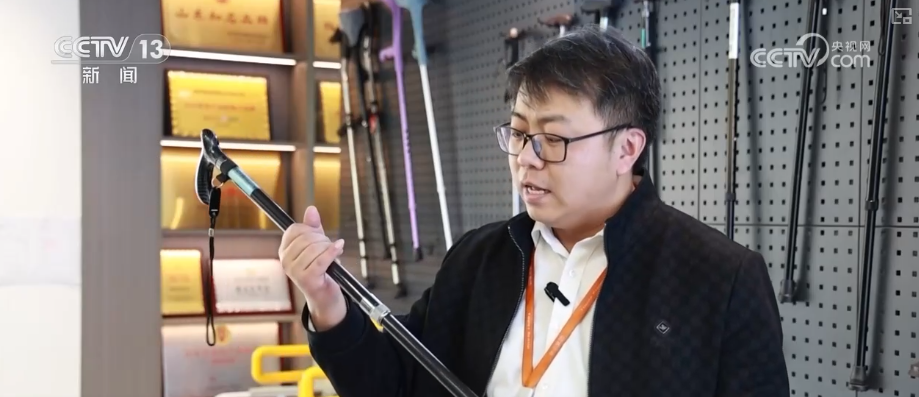 企业负责人胡超群介绍,这一款就是他们通过AI设计改造之后的最新款的拐杖,采用了碳纤维升级材质,非常轻便,可以360度旋转,在移动过程中可以更跟随脚步,使用起来比较灵活方便。